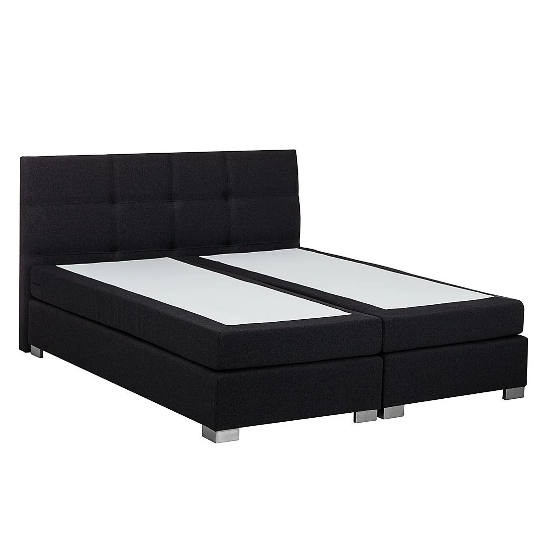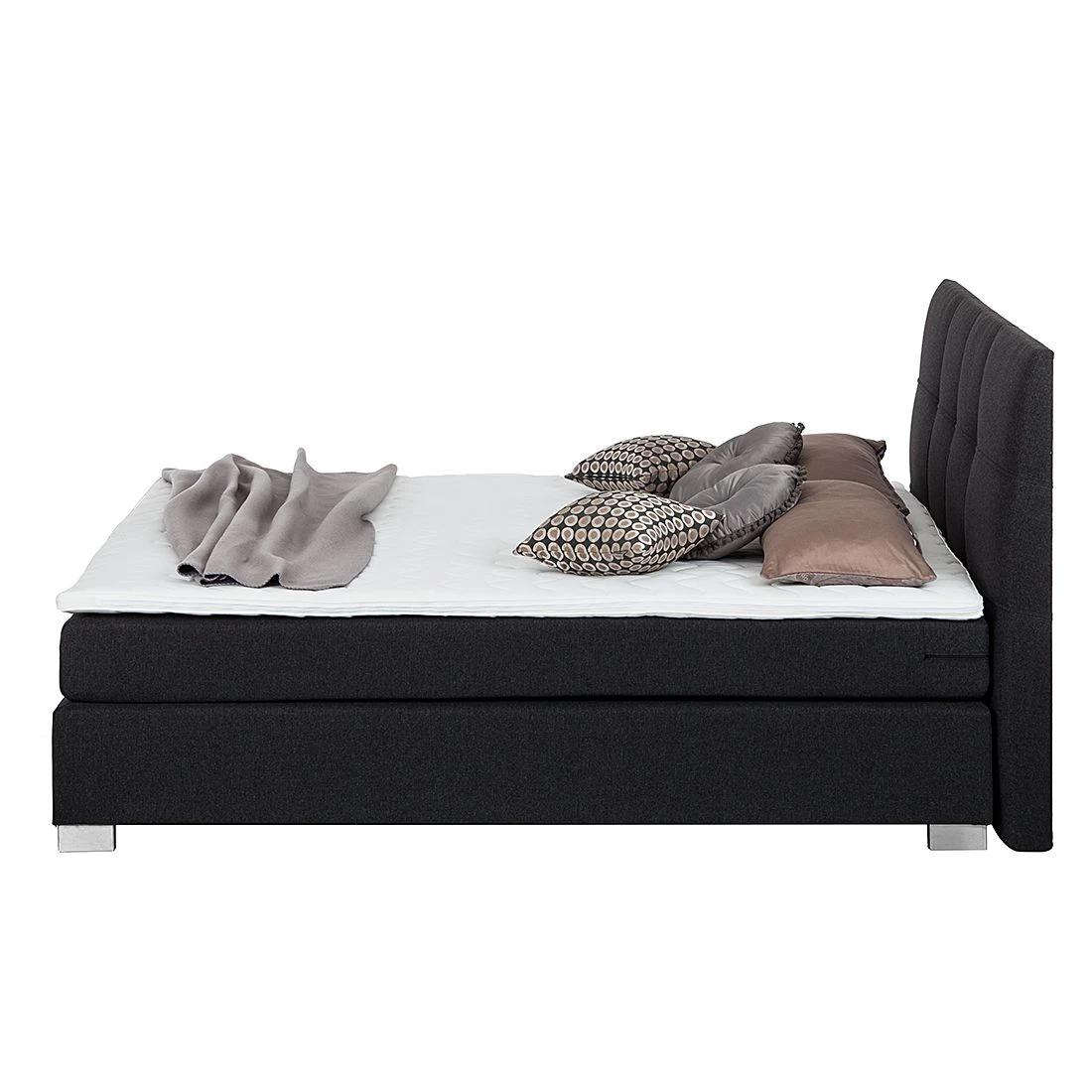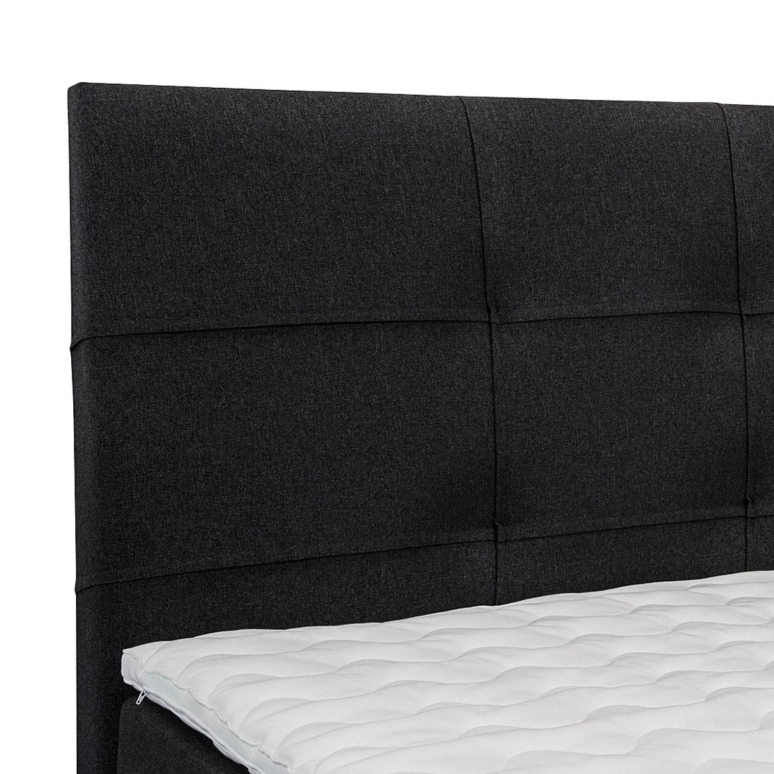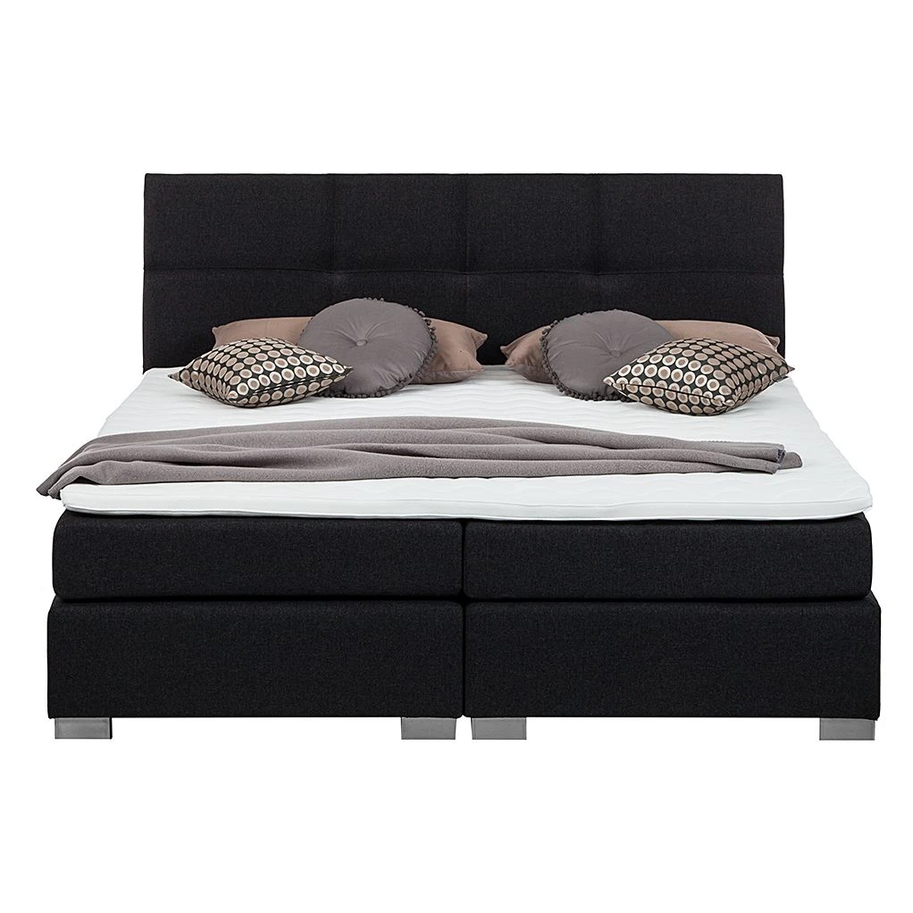 Das Boxspringbett Ramona III von Solutions verfügt über den klassischen Aufbau eines Boxspringbettes. Die Basis bildet eine zweigeteilte, gefederte Box aus hochwertiger Spanplatte, die auf insgesamt 8 grauen Holzfüßen steht. Das robuste Holzgrundgestell sowie das dazugehörige Kopfteil sind mit einem Strukturstoff in Anthrazit bezogen. Zusätzlich ist das hohe Kopfteil mit quadratischen Ziernähten versehen, die das Design abrunden. Auf der Box liegt eine zweigeteilte Matratze mit dem Härtegrad H3 (geeignet für ein Gewicht bis 100 kg). Die Matratze besteht aus einem 13 cm hohen Bonellfederkern mit Schaumabdeckung und verfügt dadurch über eine hervorragende Punktelastizität, die Deinen Körper optimal stützt. Die oberste Schicht des Boxspringbettes bildet ein durchgehender Kaltschaumtopper. Dieser besitzt antibakterielle Eigenschaften und sein Bezug ist mit einem Reißverschluss ausgestattet. So kannst Du den Topperbezug leicht abnehmen und in der Waschmaschine waschen. Zusammen mit dem Boxspringbett Ramona III von Solutions und weiteren modernen Schlafzimmermöbeln aus unserem Onlineshop richtest Du Dir Dein gemütliches Traumschlafzimmer ein.