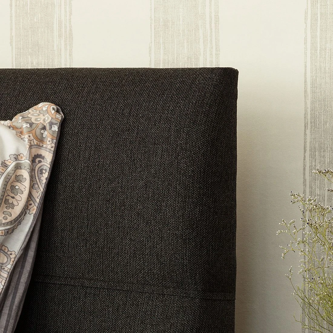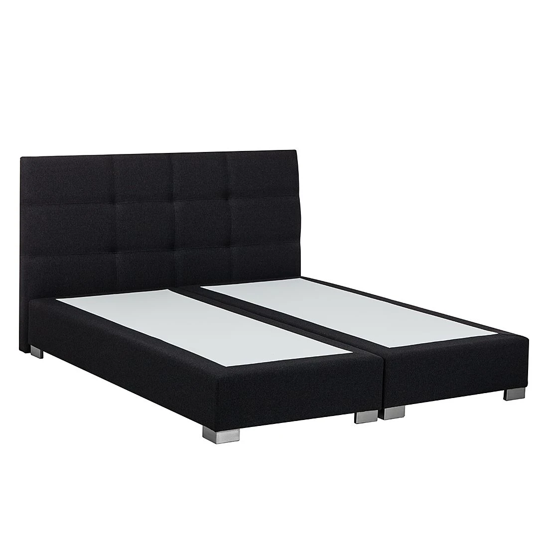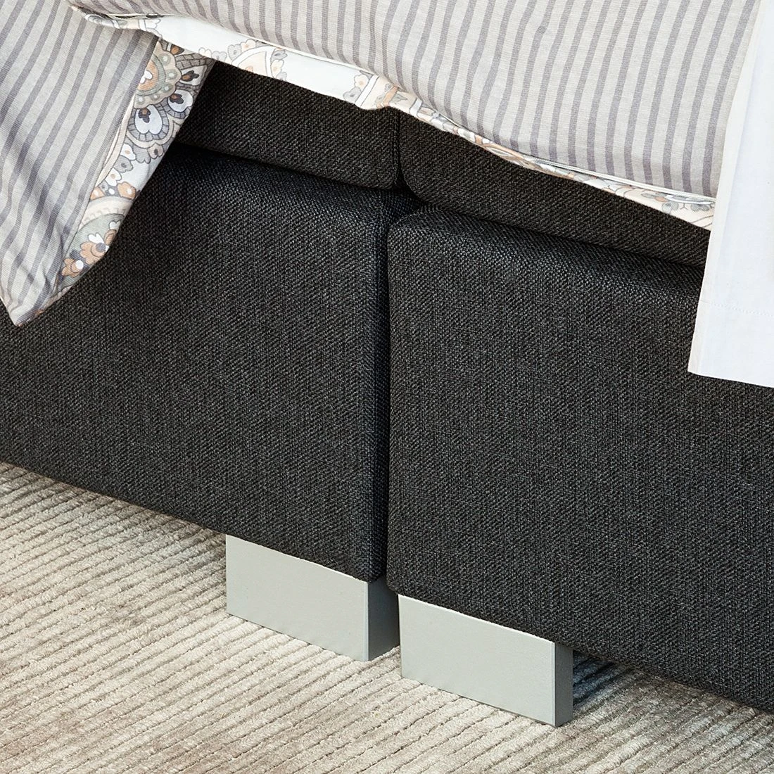 Das Boxspringbett Ramona III von Solutions verfügt über den klassischen Aufbau eines Boxspringbettes. Die Basis bildet eine zweigeteilte, gefederte Box aus hochwertiger Spanplatte, die auf insgesamt 8 grauen Holzfüßen steht. Das robuste Holzgrundgestell sowie das dazugehörige Kopfteil sind mit einem Strukturstoff in Anthrazit bezogen. Zusätzlich ist das hohe Kopfteil mit quadratischen Ziernähten versehen, die das Design abrunden. Auf der Box liegt eine zweigeteilte Matratze mit dem Härtegrad H3 (geeignet für ein Gewicht bis 100 kg). Die Matratze besteht aus einem 13 cm hohen Bonellfederkern mit Schaumabdeckung und verfügt dadurch über eine hervorragende Punktelastizität, die Deinen Körper optimal stützt. Die oberste Schicht des Boxspringbettes bildet ein durchgehender Kaltschaumtopper. Dieser besitzt antibakterielle Eigenschaften und sein Bezug ist mit einem Reißverschluss ausgestattet. So kannst Du den Topperbezug leicht abnehmen und in der Waschmaschine waschen. Zusammen mit dem Boxspringbett Ramona III von Solutions und weiteren modernen Schlafzimmermöbeln aus unserem Onlineshop richtest Du Dir Dein gemütliches Traumschlafzimmer ein.