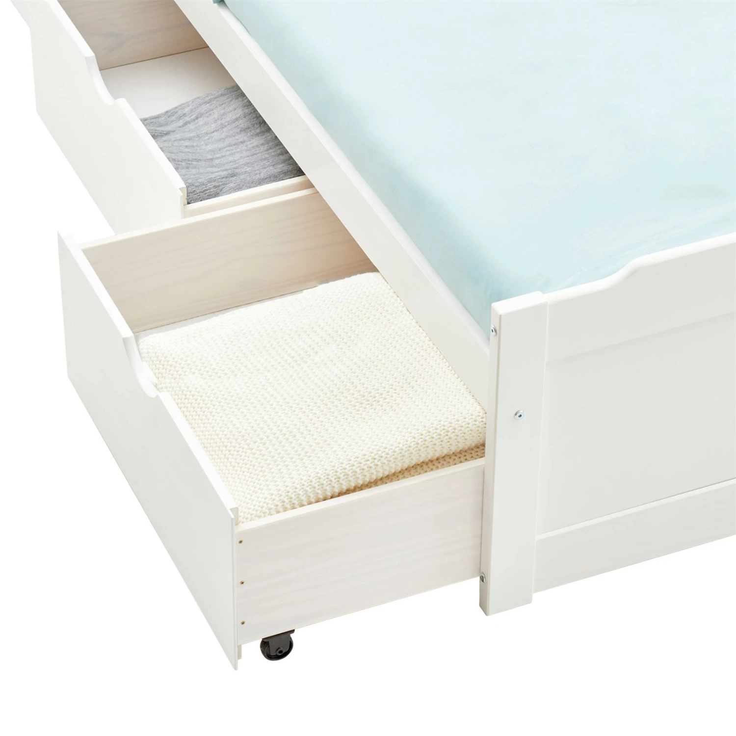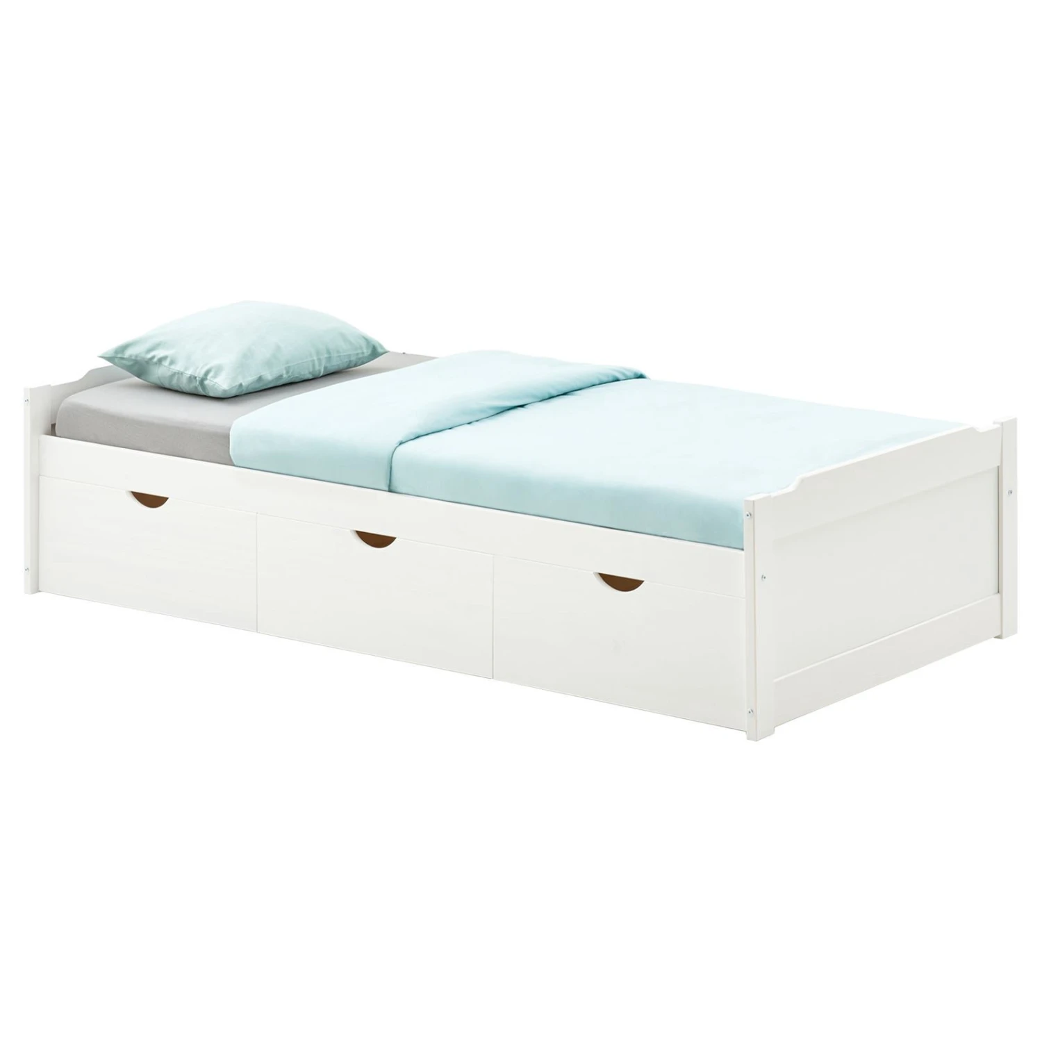ist eine stilvolle Kombination aus Einzelbett und Stauraum. Mit einer Liegefläche von 90 x 190 cm (B x L) hat Ihr Kind genügend Platz zum Schlafen, Spielen und Relaxen. In den 3 Schubladen lässt sich einiges an Spielsachen, Kissen oder Decken verstauen. Das eingearbeitete MDF, an Kopf- und Fußteil, verleiht dem Jugendbett das gewisse Etwas und lädt zu einem erholsamen Schlaf ein.