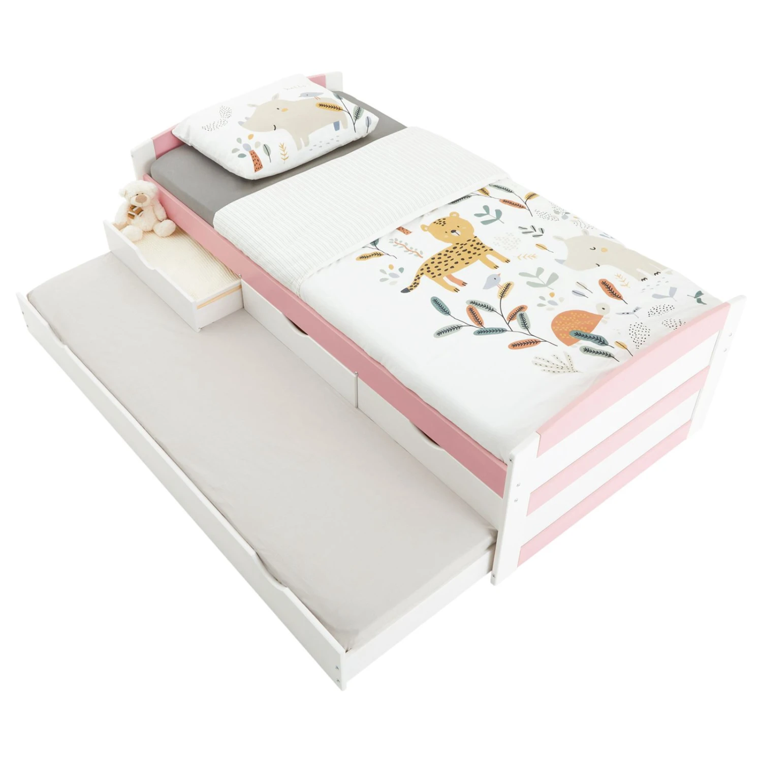 bietet Funktionalität in mehreren Bereichen: Schlafen, Übernachten und Verstauen. Im Funktionsbett findet Ihr Kind erholsamen Schlaf und für spontane Übernachtungsgäste zaubern Sie mit dem Auszugsbett einen gemütlichen Schlafplatz, selbst auf kleinstem Raum. In den geräumigen Schubkästen können Kissen, Decken oder Spielzeug problemlos verstaut werden. Mit seinem modernen Design passt dieses Schubladenbett in jedes Jugend- und Kinderzimmer.