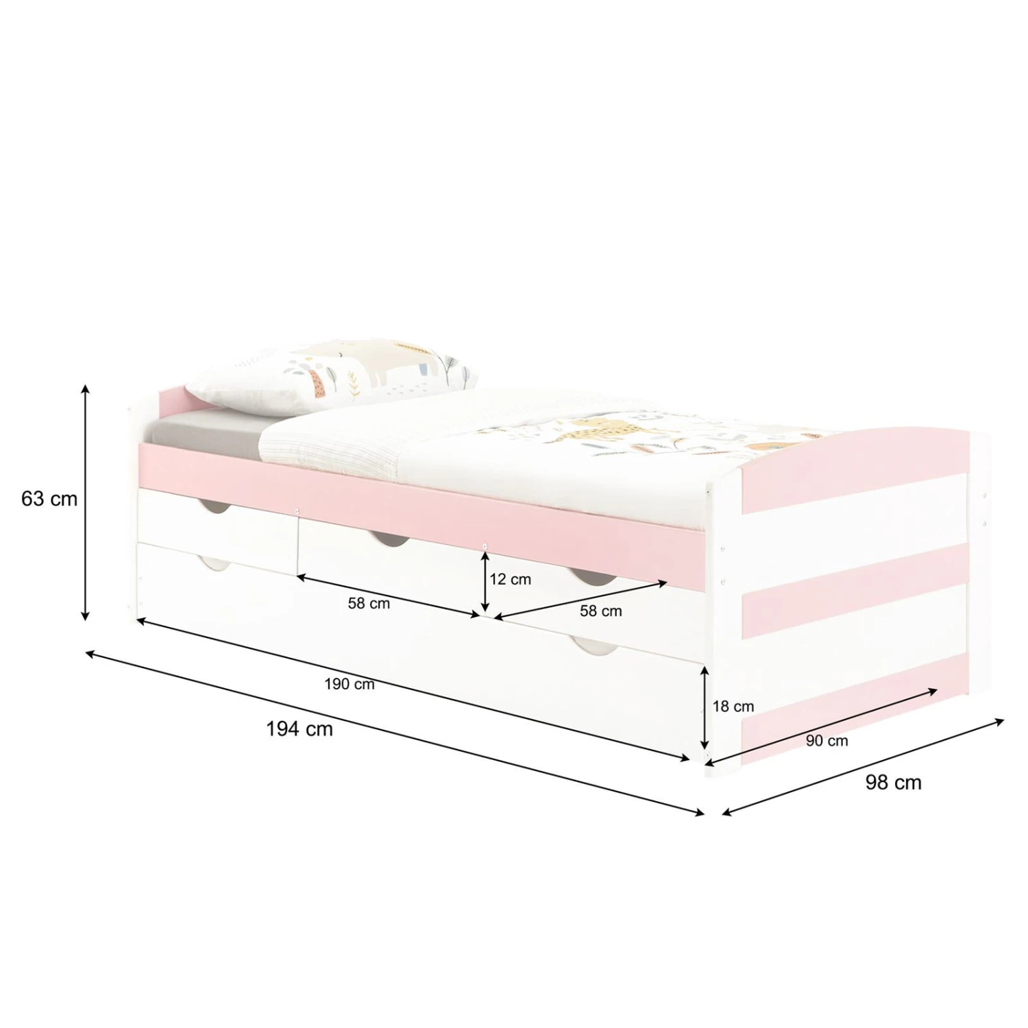 - Das Stauraumbett ist aus massivem Kiefernholz gefertigt und in weiß/rosa lackiert. Die verwendeten Lacke sind schadstoffarm und lösemittelfrei.