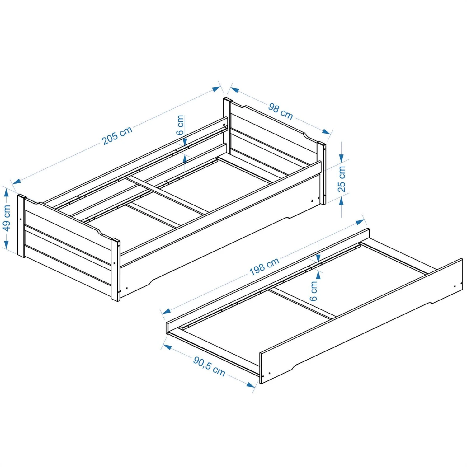 ist ein echtes Bettwunder. Mit der zusätzlichen Gästeliege, die sich ganz einfach ausziehen lässt, schaffen Sie eine Schlafgelegenheit für einen Übernachtungsgast. Aber nicht nur funktionell punktet das Bett, sondern auch optisch macht es was her. Das Grundgestell ist aus massivem Kiefernholz gefertigt und in den Kopf und Fußteilen sind weiß lackierte MDF Platten eingearbeitet.