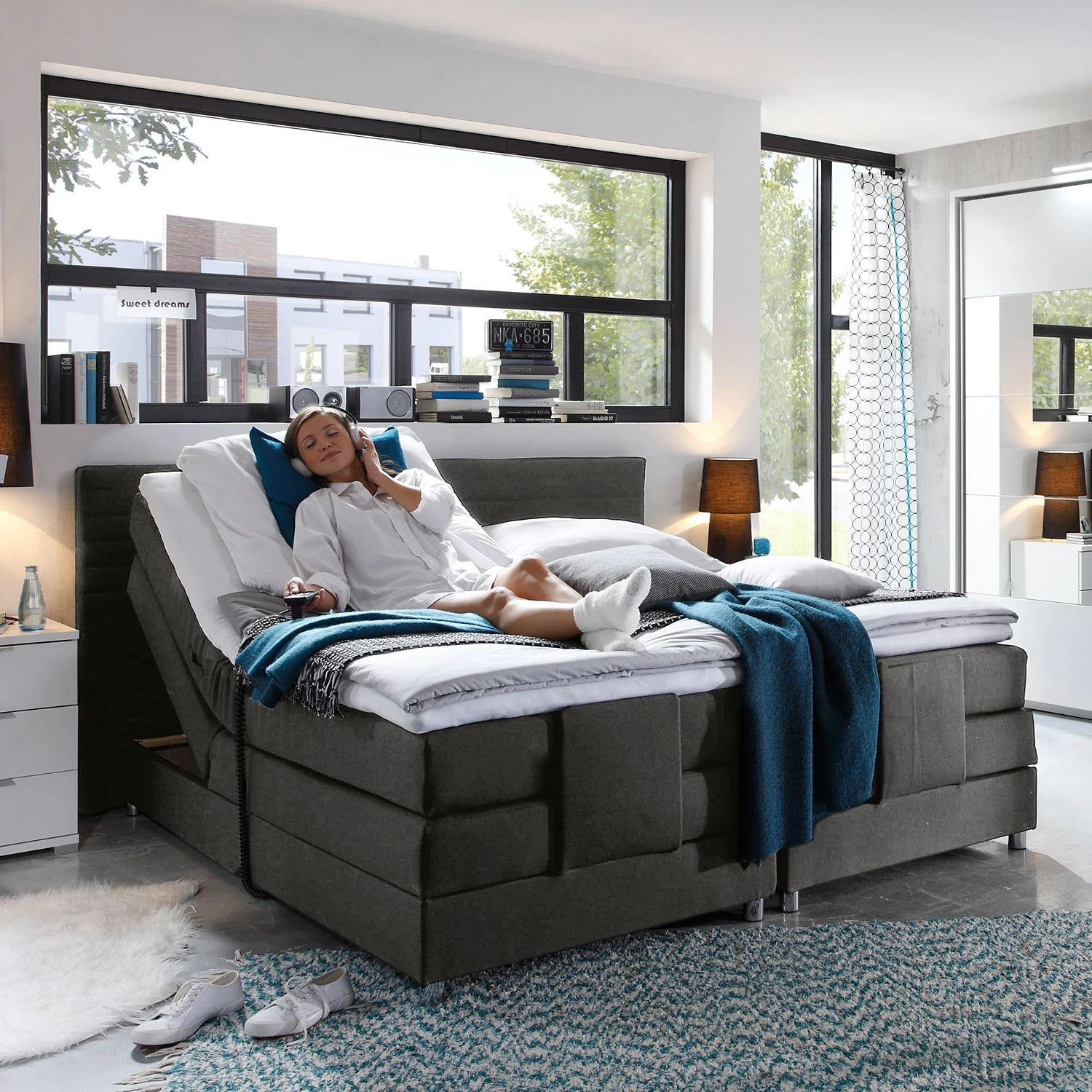 - Lieferumfang: Boxspringbett inkl. Topper, Elektromotor & Kabelfernbedienung