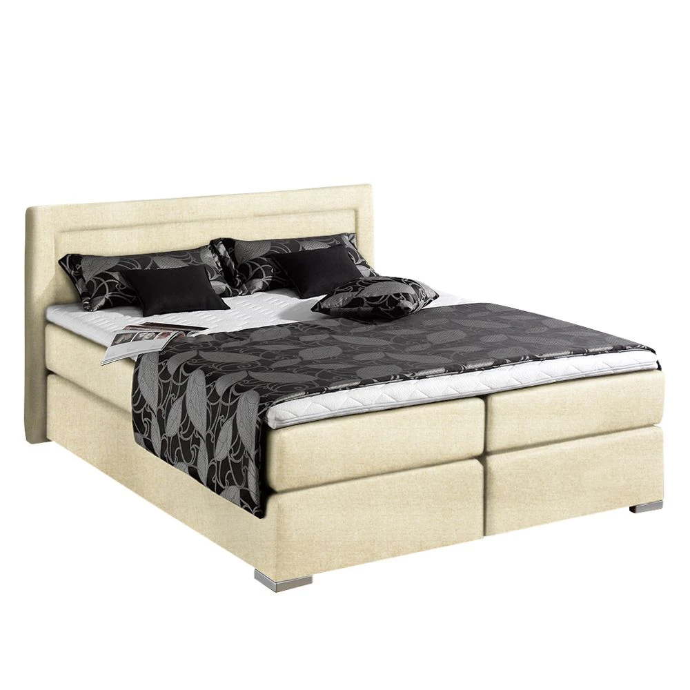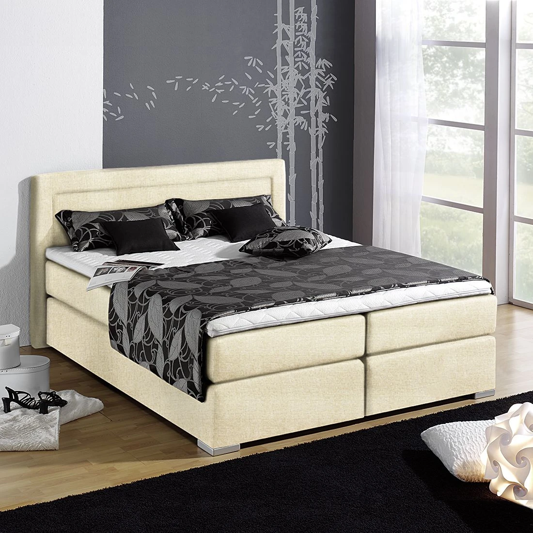 Holen Sie sich Komfort im eleganten Gewand. Der aparte Farbton Ecru des angenehmen Strukturstoffes passt perfekt in ein modernes, stilvoll eingerichtetes Schlafzimmer. Das gewisse Etwas bekommt das Boxspringbett Sandor durch die dekorative Umrandung des bequemen Kopfteils.