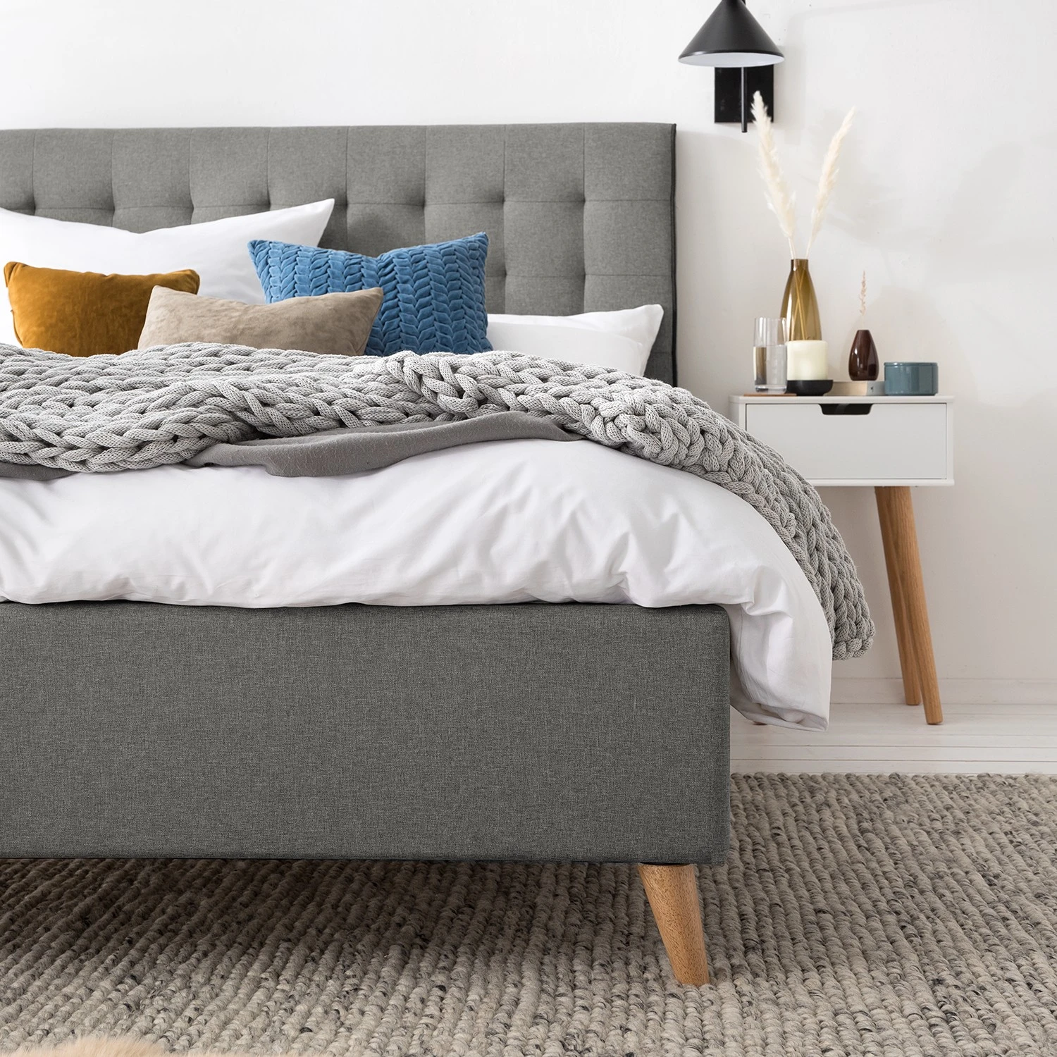 - Lieferumfang: Polsterbett ohne Lattenrost, Matratze & Dekoration