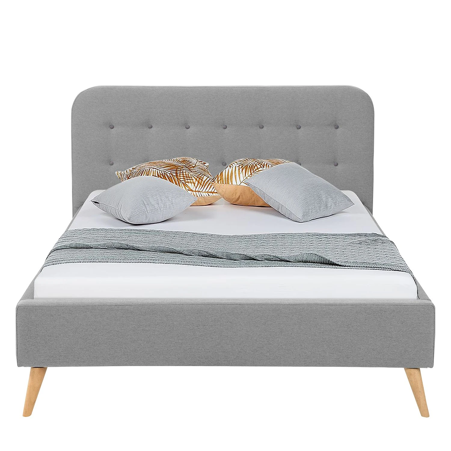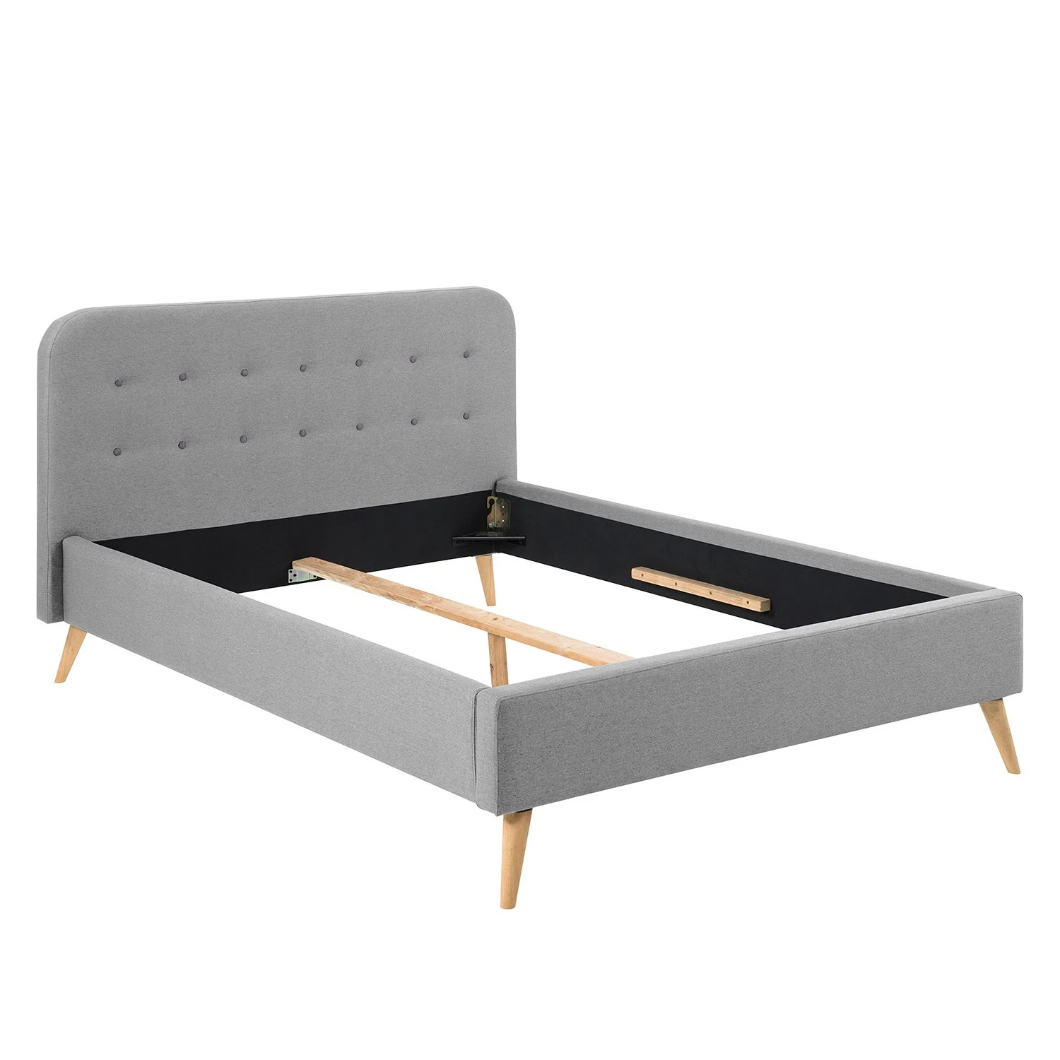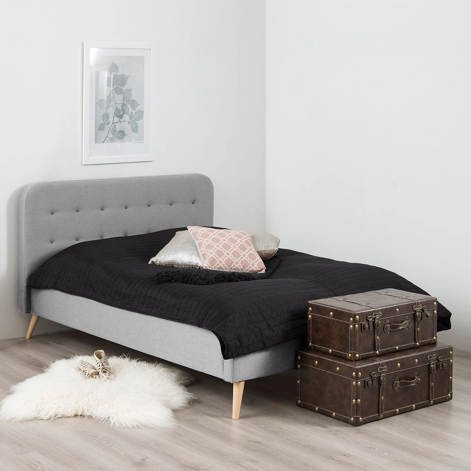 Design mit einer skandinavischen Note entspricht dem zeitgenössischen Geschmack. In diesen Einrichtungsstil fügt sich das Polsterbett Klink II dank seines nordischen Entwurfs ideal ein. Besonders auffällig an dem Möbel präsentiert sich das Kopfteil mit abgerundeten Ecken und dekorativen Knopfsteppungen. Das Bett hat schräg gestellte Füße aus massivem Gummibaumholz, die einen schönen Kontrast zu dem Bezug mit Webstoff aus strapazierfähigem Polyester setzen. Der gepolsterte Rahmen wurde aus massivem Kiefernholz und Sperrholz gefertigt. Mithilfe der soliden Mitteltraverse lassen sich ein bzw. zwei Lattenroste sicher auflegen, ohne zu verrutschen. Das Polsterbett Klink II ist in verschiedenen Größen erhältlich, je nachdem wie großzügig man sich betten möchte.