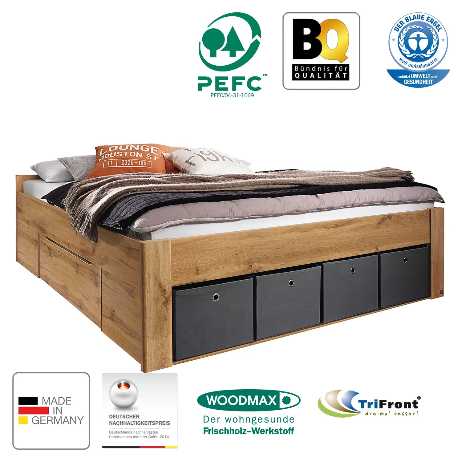 - Lieferumfang: Bett mit 2 Schubkästen und 4 Stoffkisten
