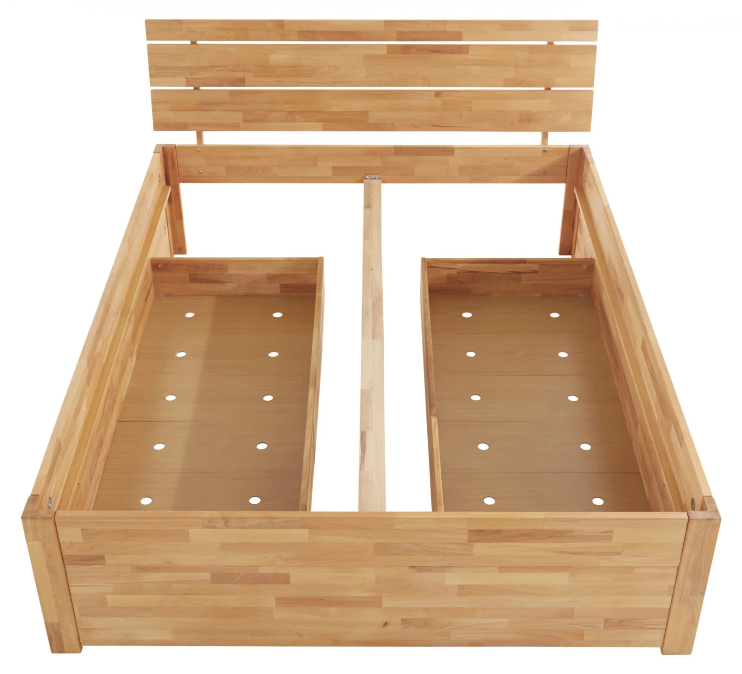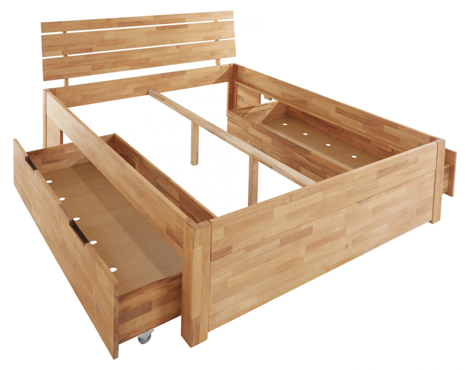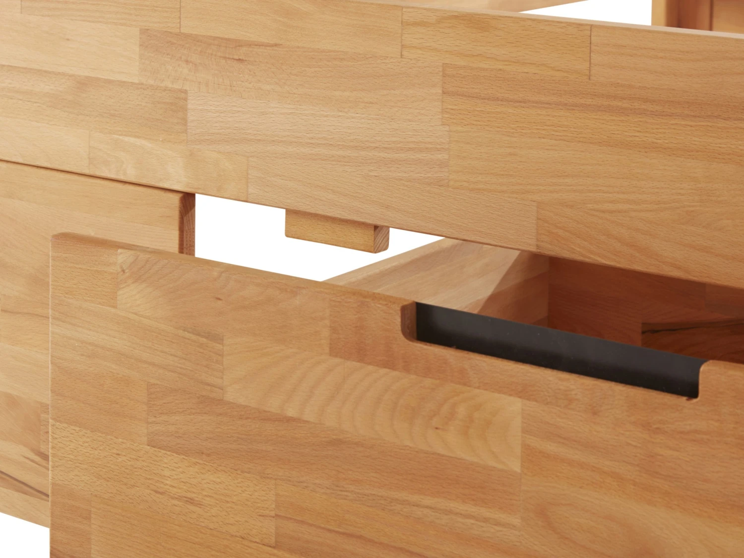 Das mit Naturöl veredelte Buchenholz sorgt für eine natürliche Atmosphäre in Ihrem Schlafzimmer. Als besonderer Blickfang dienen die modernen Schubladen-Handgriffe aus schwarzen Blech, die sich sowohl an den Bettschubladen wie auch an den Schubladen der Nachtkommode wiederfinden. Die Nachttische können separat bestellt werden.