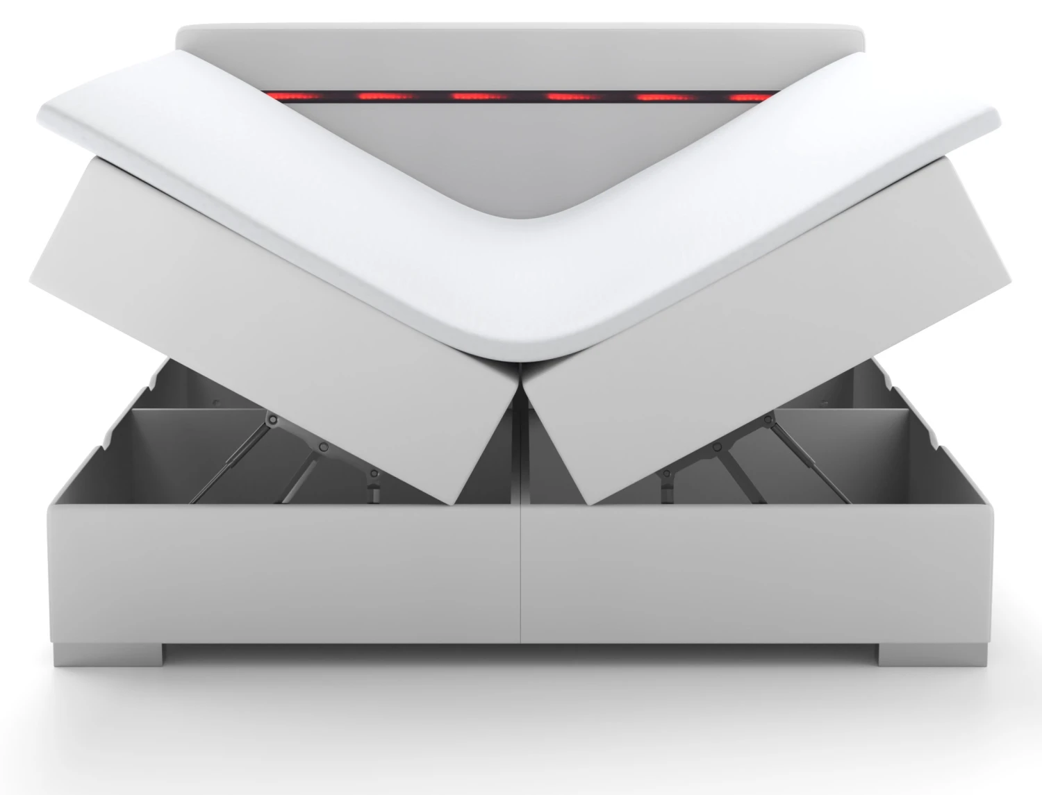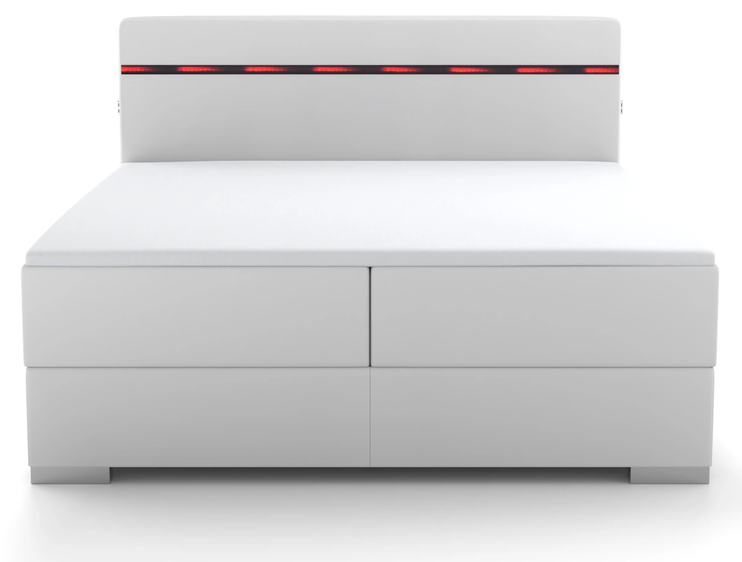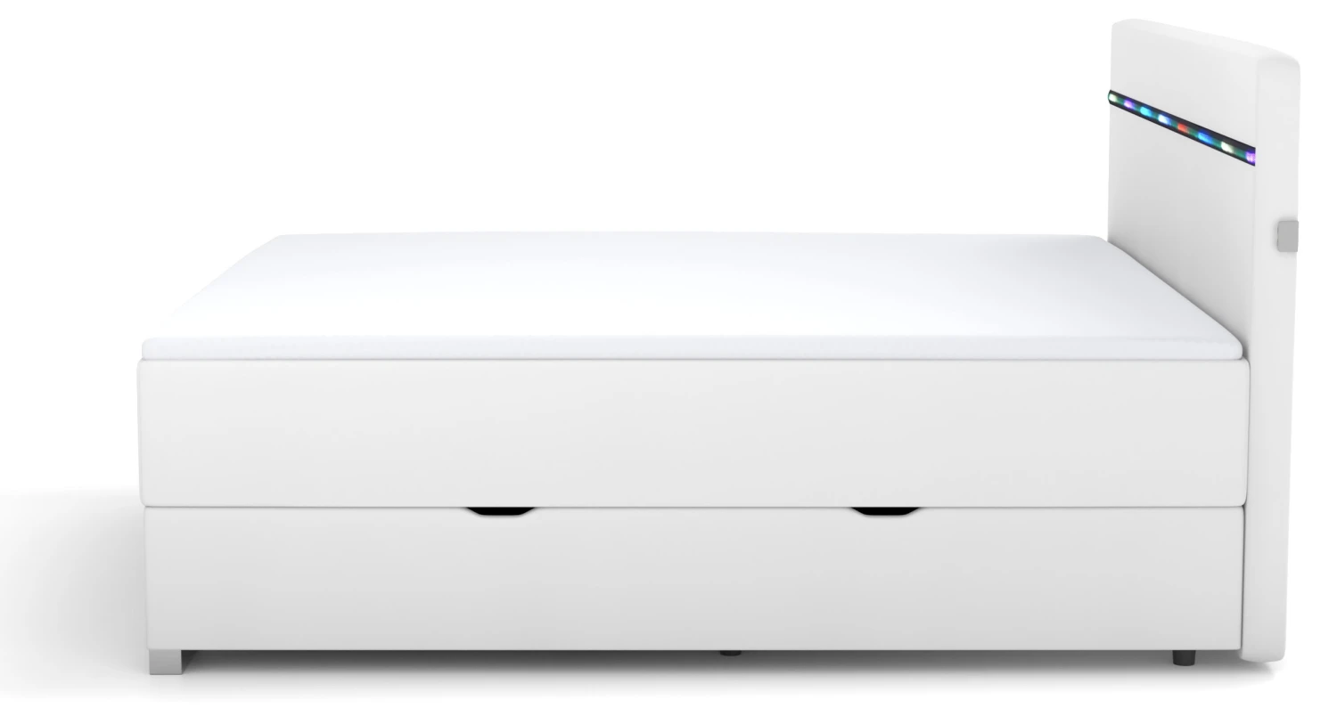 - Lieferumfang: Boxspringbett inklusive 2x Bonell-Boxmatratze, 1x Topper, LED-Beleuchtung mit Fernbedienung und 2x USB-Anschluss.
